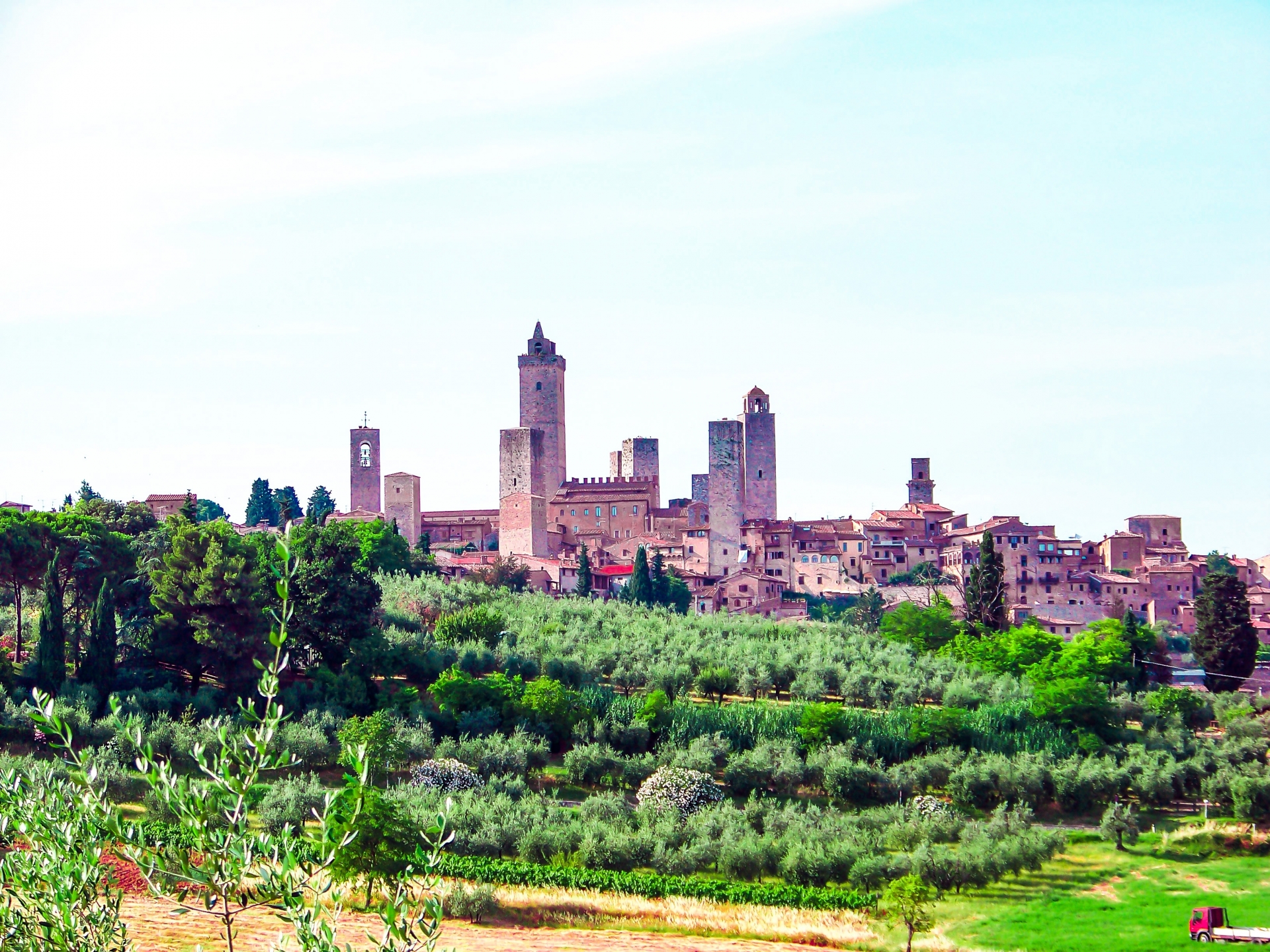 schönsten Gegenden der Toskana, die Landschaften der Zypressen und Pinien, der Weinberge und alten toskanischen Bauernhöfe. Zunächst erreichen wir den Ort San Gimignano, der sich mit seinen Geschlechtertürmen